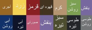 | رنگ | سبز تیره, سبز روشن, آبی تیره, آبی روشن, آجری, زرد, قرمز, طوسی تیره, طوسی روشن, کرم, مشکی, سفید, بنفش, قهوه ای, صورتی |